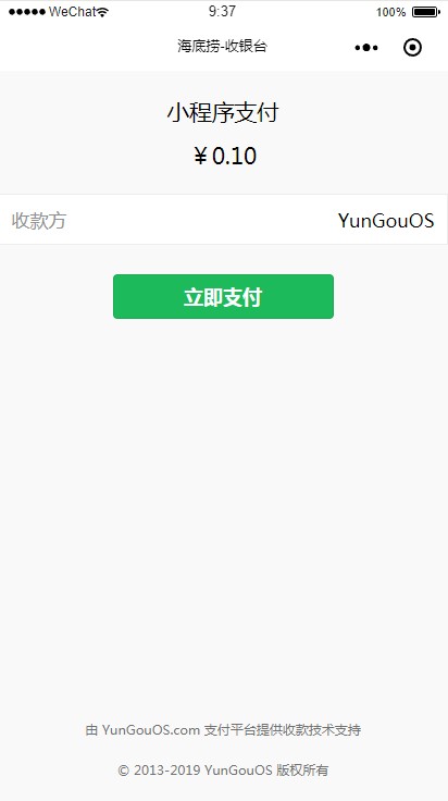 支付收银小程序页面顶部的title 可自定义品牌名称 不传默认为 “收银台” 如传递参数 “海底捞” 页面则显示 “海底捞-收银台”