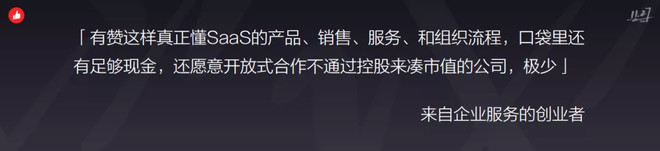 前段时间见了几个创业者,其中有两个人分别跟我说了一样的话,让我有点小骄傲。像有赞这样真正懂 SaaS 的产品、销售、服务、组织流程,口袋里还有足够的现金,且还愿意开放式的合作不通过控股来凑市值的公司,极少」。
