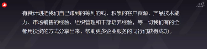 在中国的几千万家公司里,怎么做一个 SaaS 公司的长期的设计,一个 SaaS 公司的组织文化和干部培养人才的体系,没有企业比有赞做的强,我们希望把丰富的经验给到大家,因为今天在中国可能有且只有这样的一家公司是踏过了所有的路,且有足够多的资本,有足够多的成功经验可以复制给大家,这就是我们为什么做投资的初心。