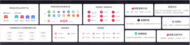 从 2015 年的年底我们决定,有赞要变成一家商家服务公司,彻底帮商家解决问题。过去四年我们建立了非常强大的能力图谱,昨天我们花了一些时间把它简单的排列了一下,大家可以感受一下,包括了我们的 SaaS 软件系统,打通多平台,运营体系、服务市场,安全护航、有赞云、有赞担保等等。