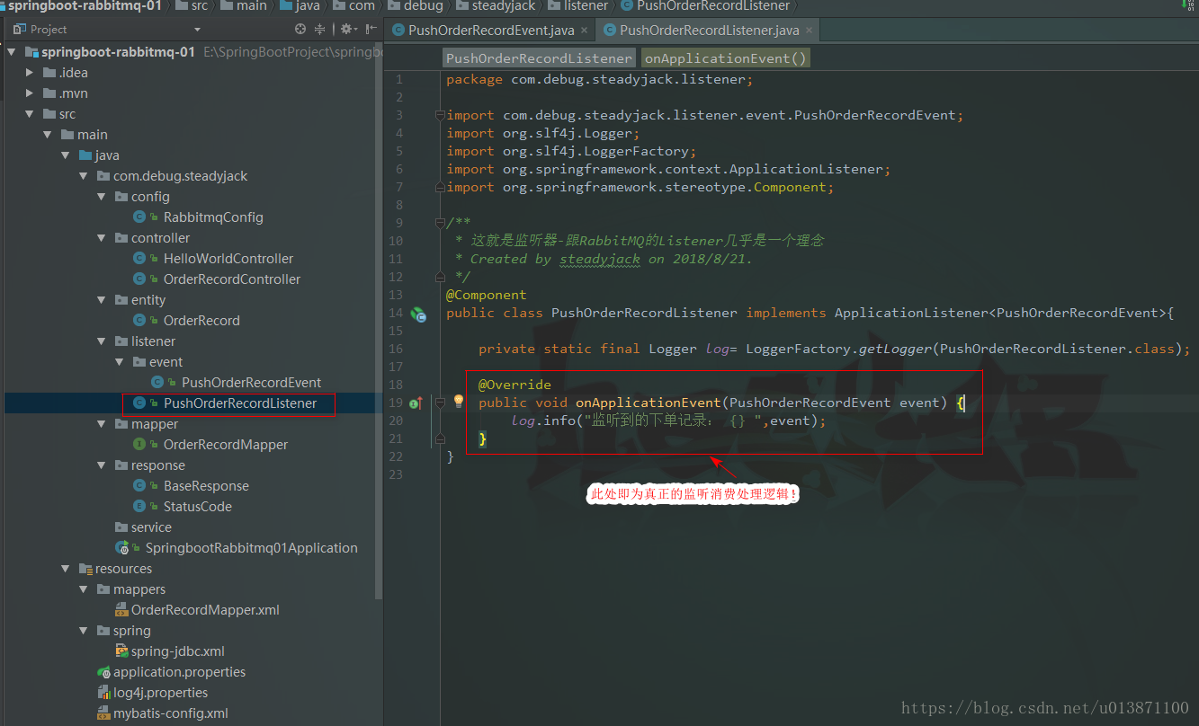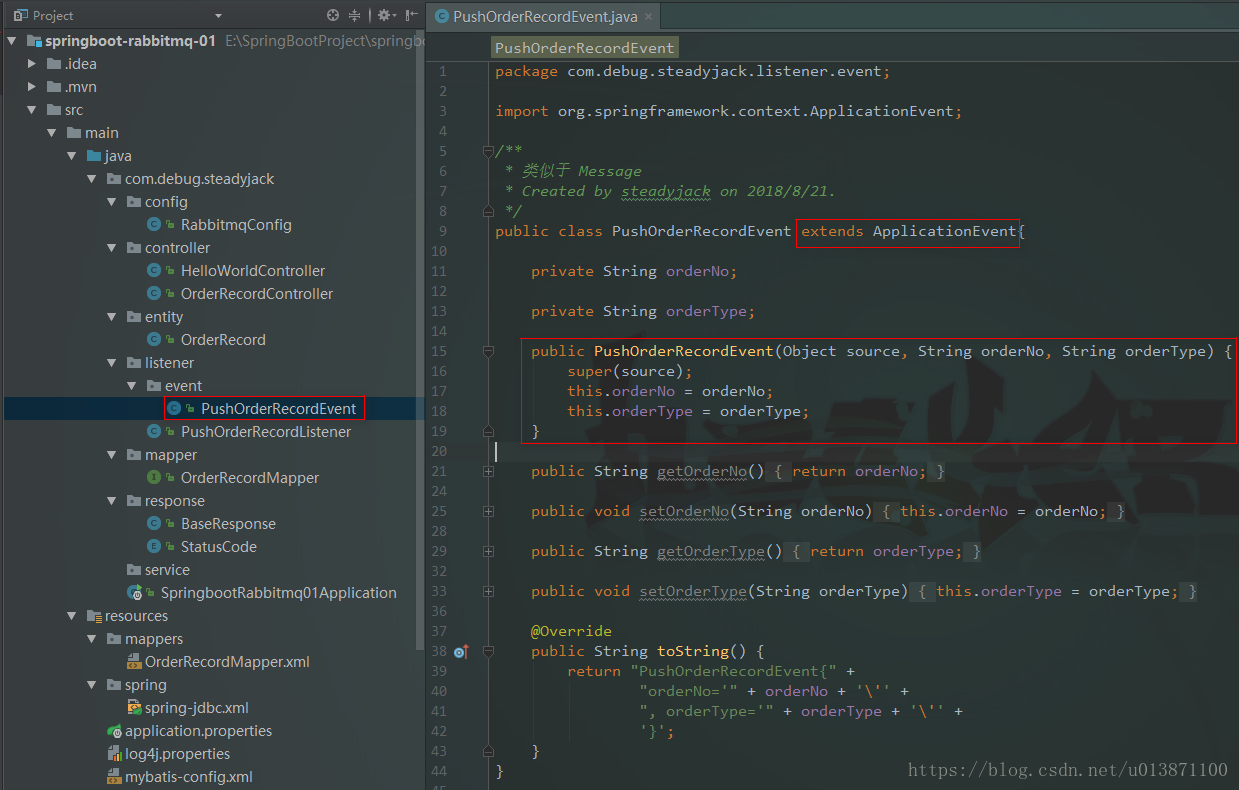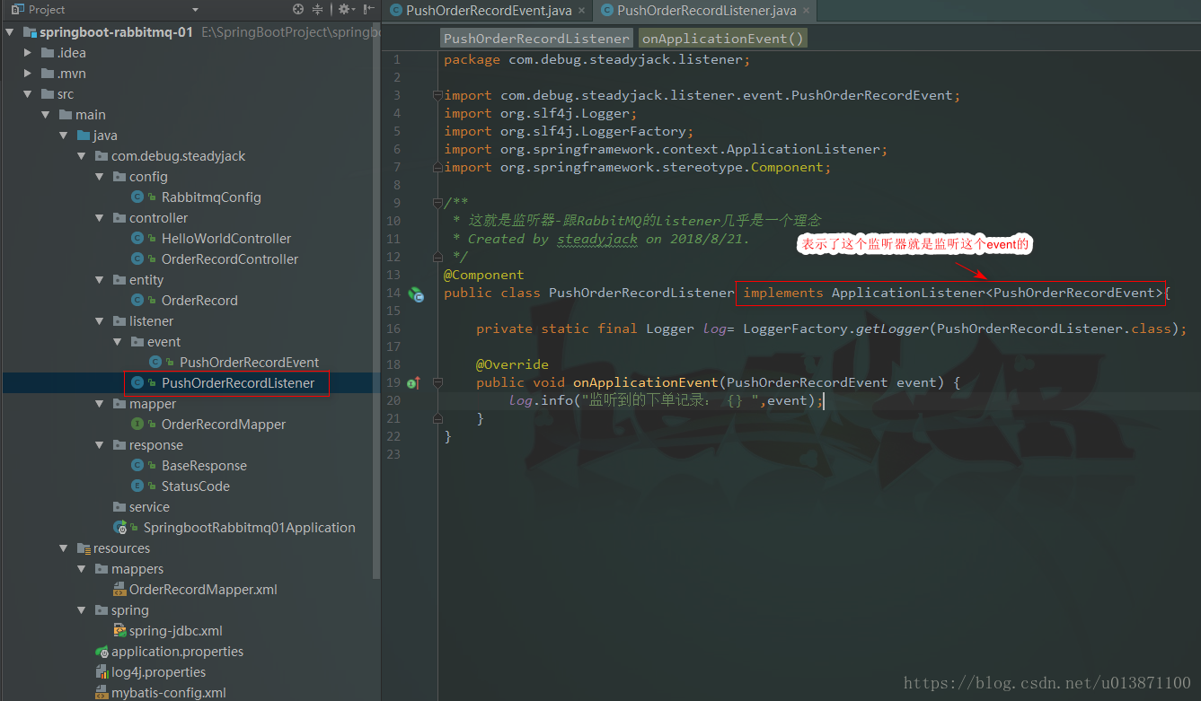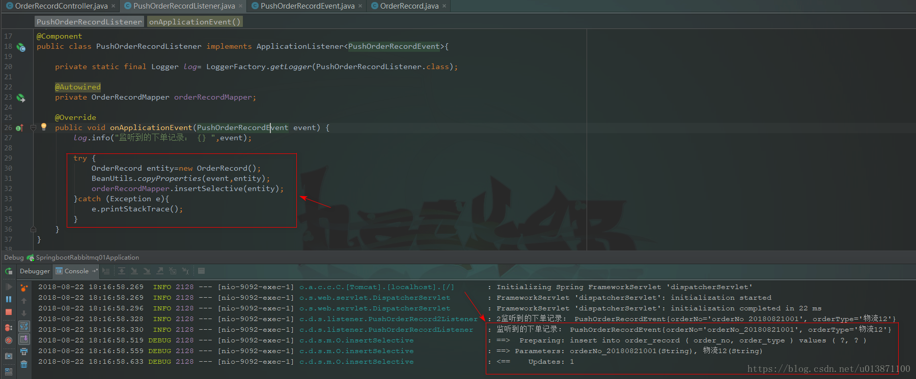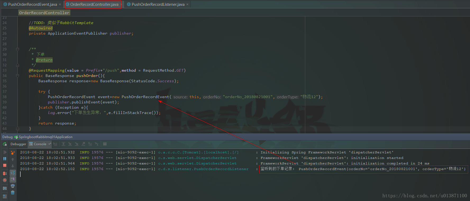 2、基于上面的大局流程,我们首先创建一个异步消息event,用于存储订单记录信息,然后创建一个listener用于接受信息并进行业务逻辑处理,最后创建controller用于发送信息。相关的event、listener已经controller如下所示: