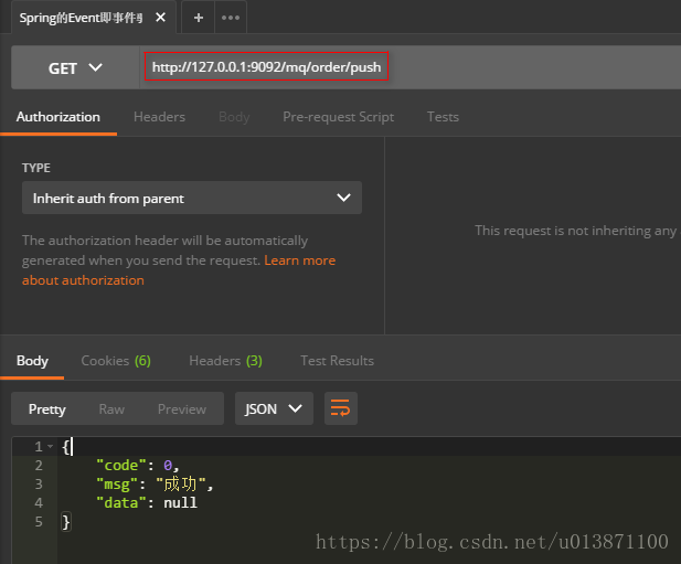 3、在上面的代码中,我想有一定基础的童鞋均可以看懂,大体的意思是创建好消息,然后用publisher组件发送消息,而这个消息由“下单记录”来充当,当响应这个controller时,自然而然publisher组件将这个event发送出去,最终由专门监听这个event的listener监听到并进行处理,下面run起来,postman模拟请求这个controller的方法,如下所示: