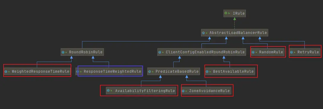 Ribbon 的负载均衡策略和之前讲过的负载均衡策略有部分相同,先来个全面的图,看下 Ribbon 有哪几种负载均衡策略。