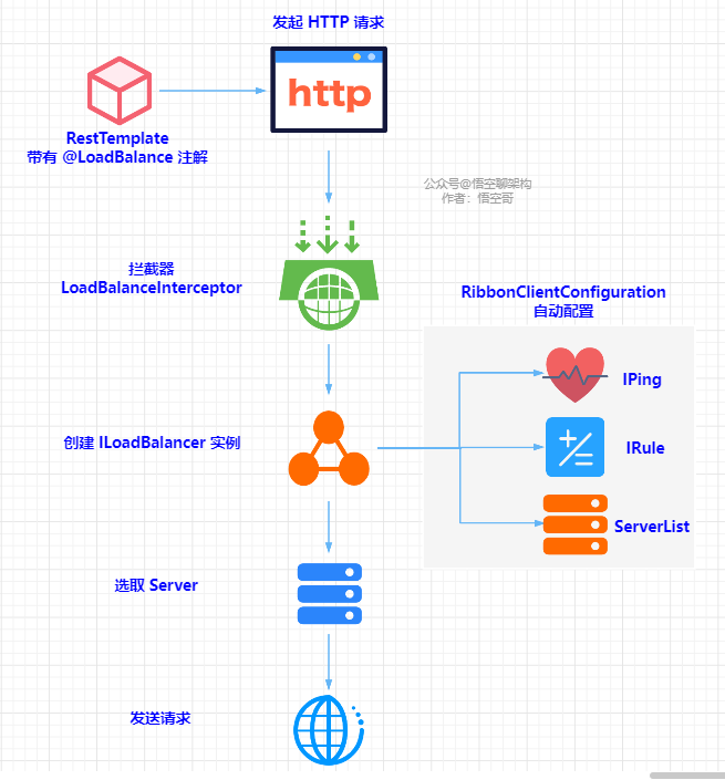 结合上面介绍的 Ribbon 核心组件,我们可以画一张原理图来梳理下 Ribbon 拦截请求的原理: