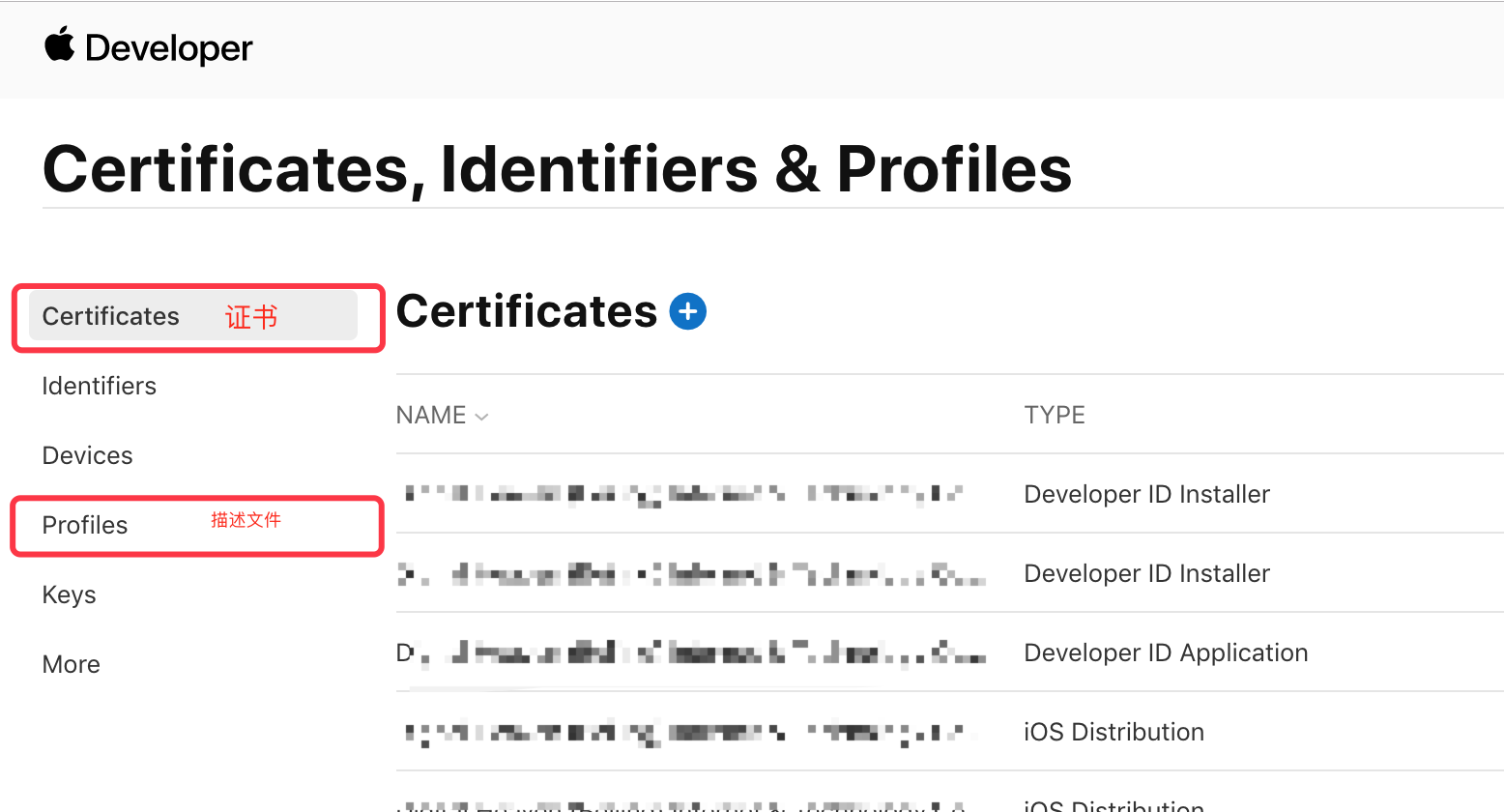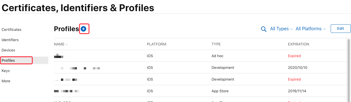 在证书管理页面选择 “Profiles”,可查看到已申请的所有描述文件,点击页面上的加号来添加一个新的描述文件: