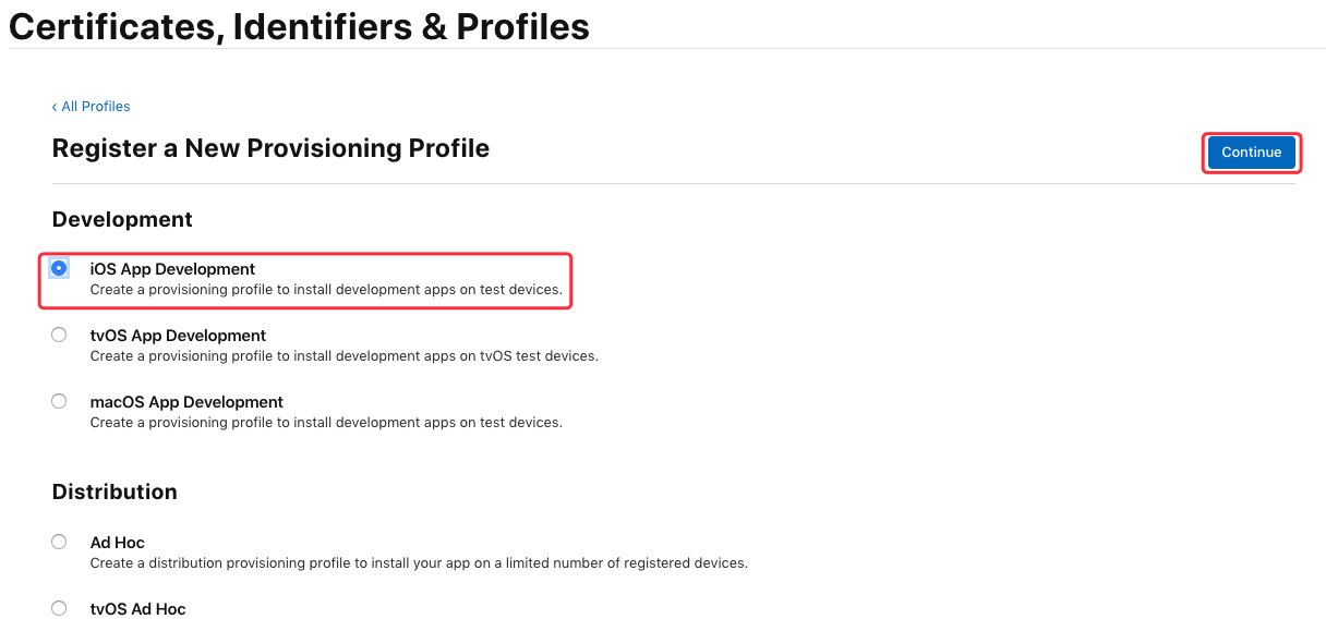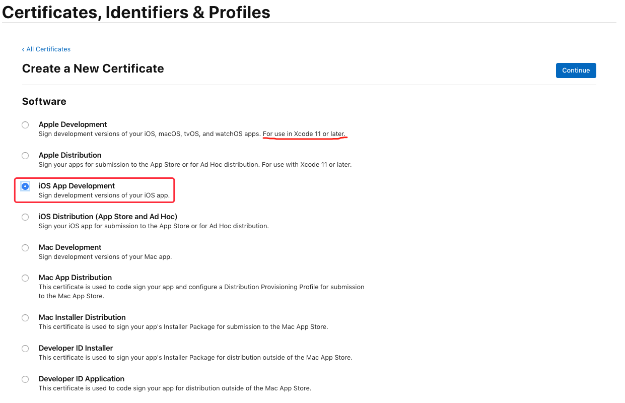 在 “Development” 栏下选中 “iOS App Development”,点击“Continue”按钮: