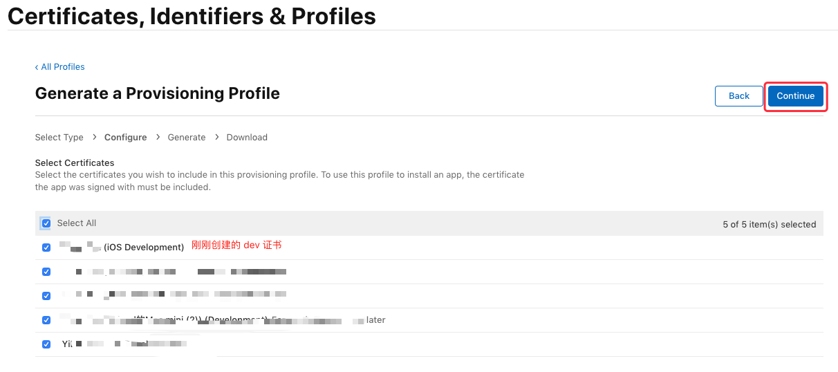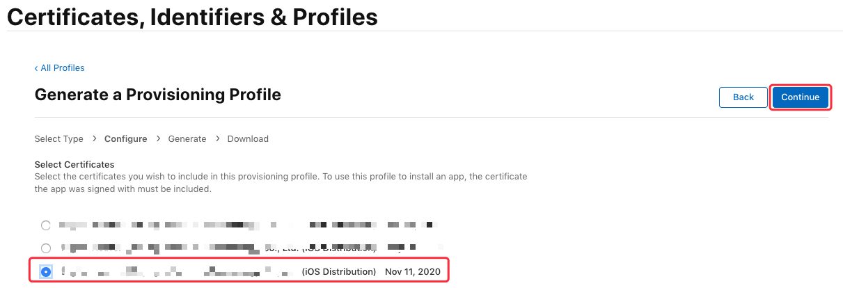 接下来选择需要绑定的发布证书(iOS Distribution),这里勾选刚刚生成的发布证书”,点击“Continue”: