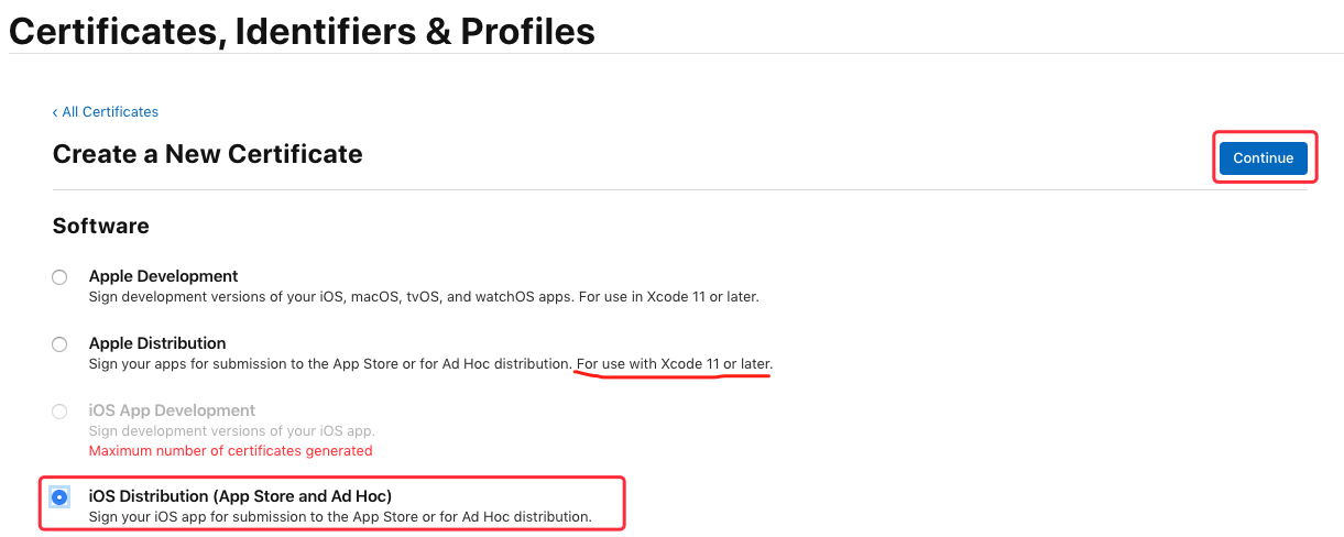 在 “Software” 栏下选中 “App Store and Ad Hoc”,点击 “Continue”: