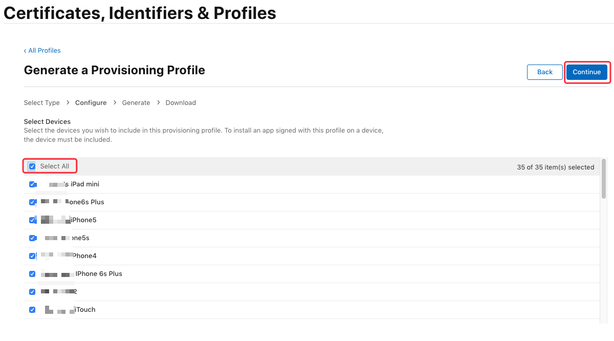 选择授权调试设备,这里建议直接勾选 “Select All”,点击 “Continue”: