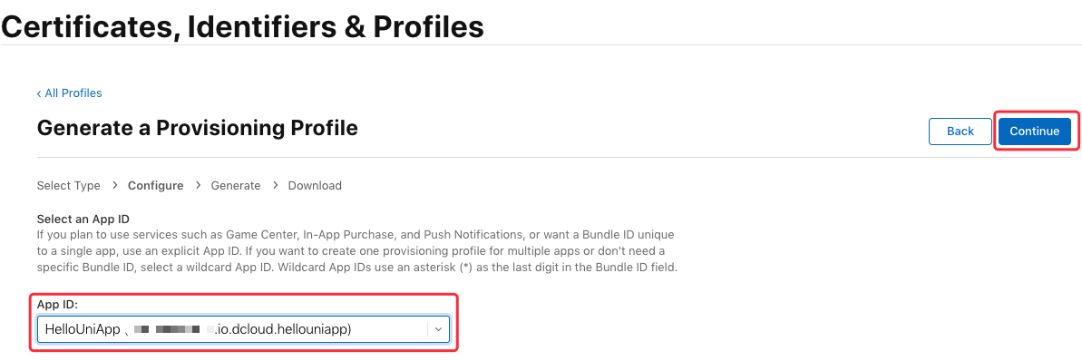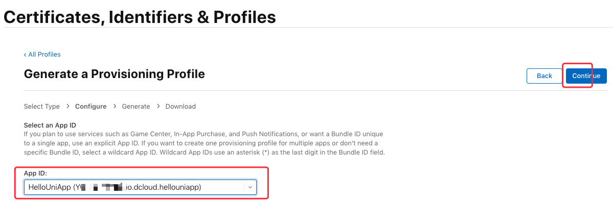 这里要选择之前创建的 “App ID” (这里是“io.dcloud.hellouniapp”),点击“Continue”: