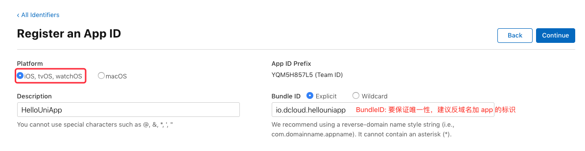 平台选择 “iOS,tvOS,watchOS”,Bundle ID 选择 “Explicit”,在 Description 中填写描述,然后填写 Bundle ID,Bundle ID 要保持唯一性,建议填写反域名加应用标识的格式 如:“io.dcloud.hellouniapp”, 然后点击 “Continue”