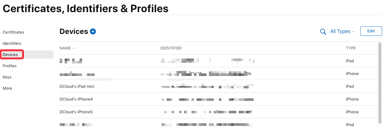 在证书管理页面选择 “Devices”,可查看到已添加的所有设备信息,点击页面上的加号来添加一个新设备: