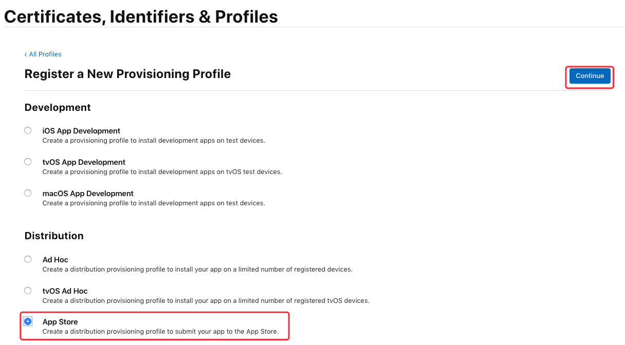 在 “Distribution” 栏下选中 “App Store”,点击“Continue”按钮: