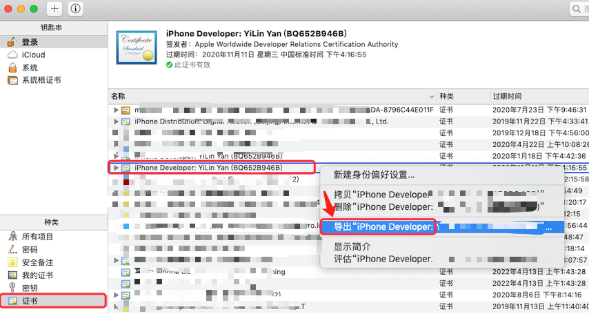双击保存到本地的 ios_development.cer 文件,会自动打开 “钥匙串访问” 工具说明导入证书成功,可以在证书列表中看到刚刚导入的证书,接下来需要导出 .p12 证书文件,选中导入的证书,右键选择 “导出...”:
