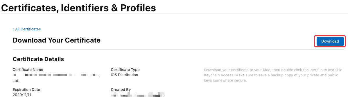 生成证书后选择 “Download” 将证书下到本地 (ios_development.cer):