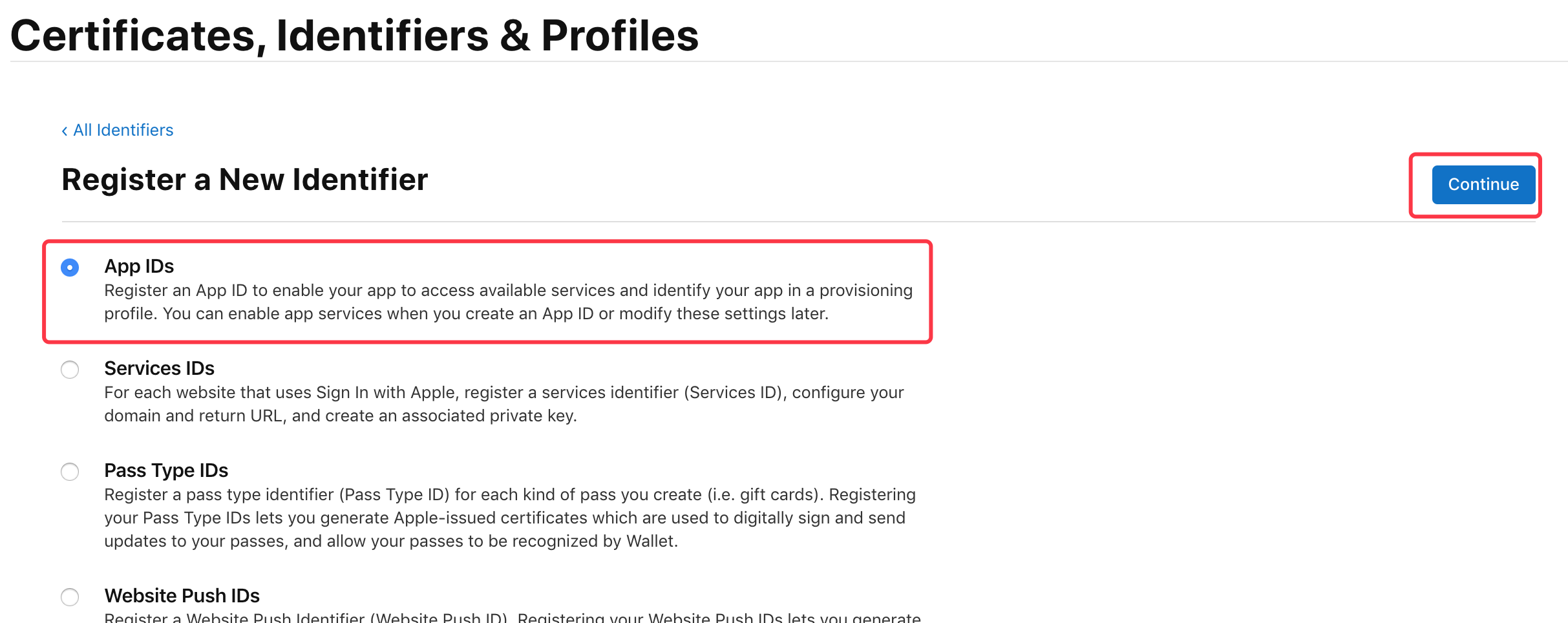 选择标识类型为 “App IDs”,然后点击 “Continue”
