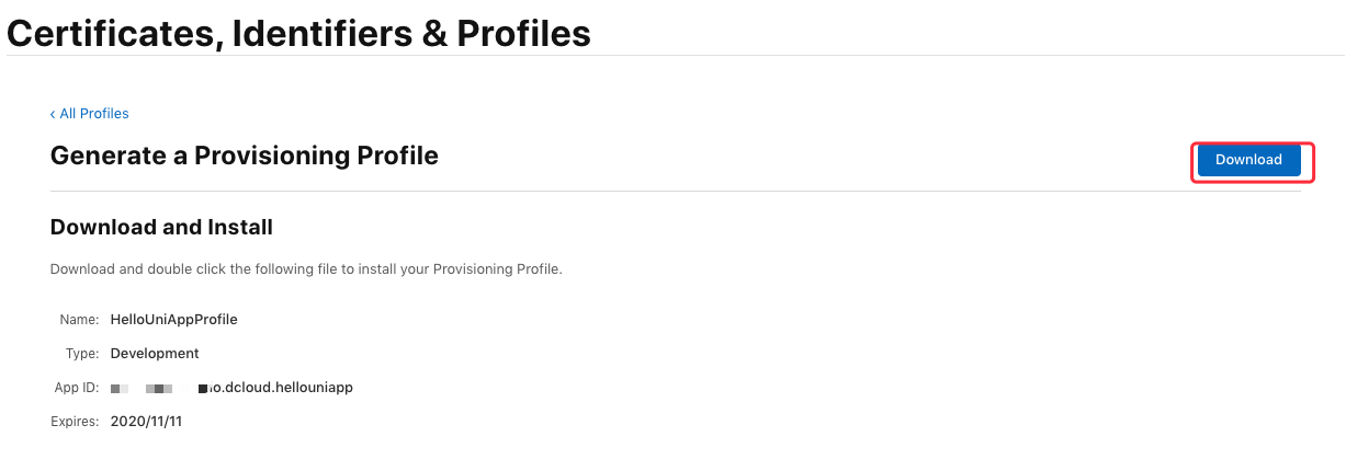 然后点击 “Download” 将描述文件下载到本地(文件后缀为 .mobileprovision)