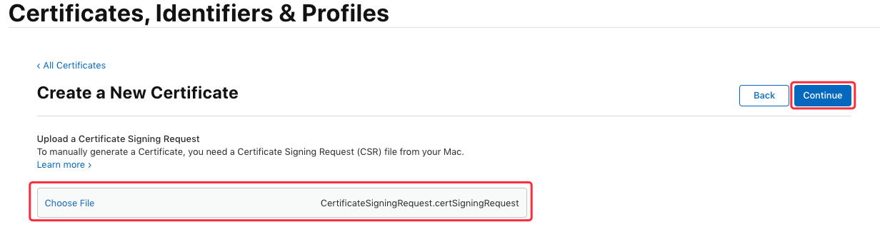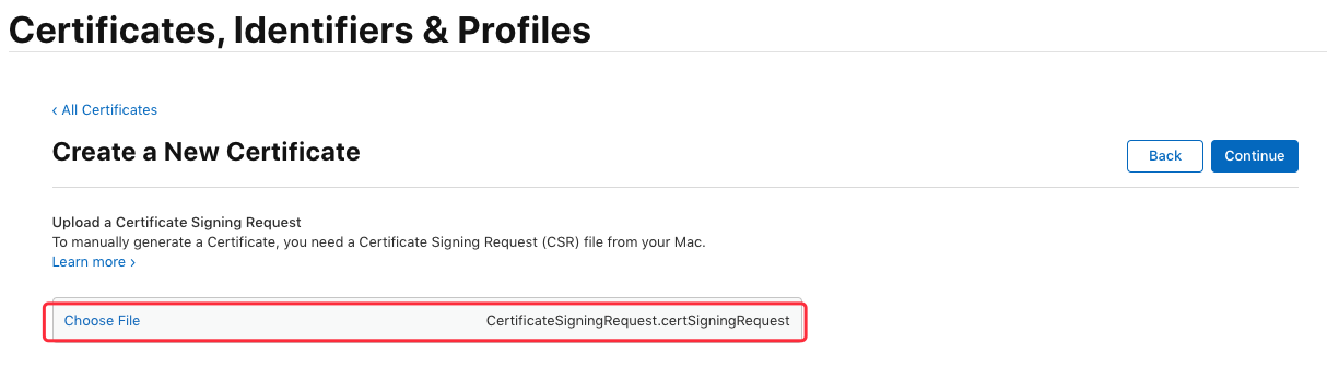 接下来同样需要用到之前生成的证书请求文件,点击“Choose File...”选择刚刚保存到本地的 “CertificateSigningRequest.certSigningRequest”文件,点击 “Continue” 生成证书文件:
