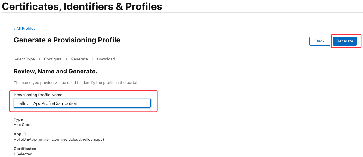 接下来输入描述文件的名称(如“HelloUniAppProfileDistribution”), 点击 “Generate” 生成描述文件: