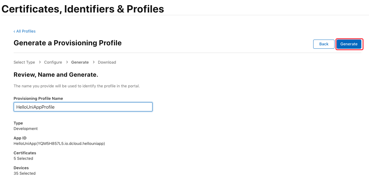 输入描述文件的名称(如“HelloUniAppProfile”), 点击 “Generate” 生成描述文件:
