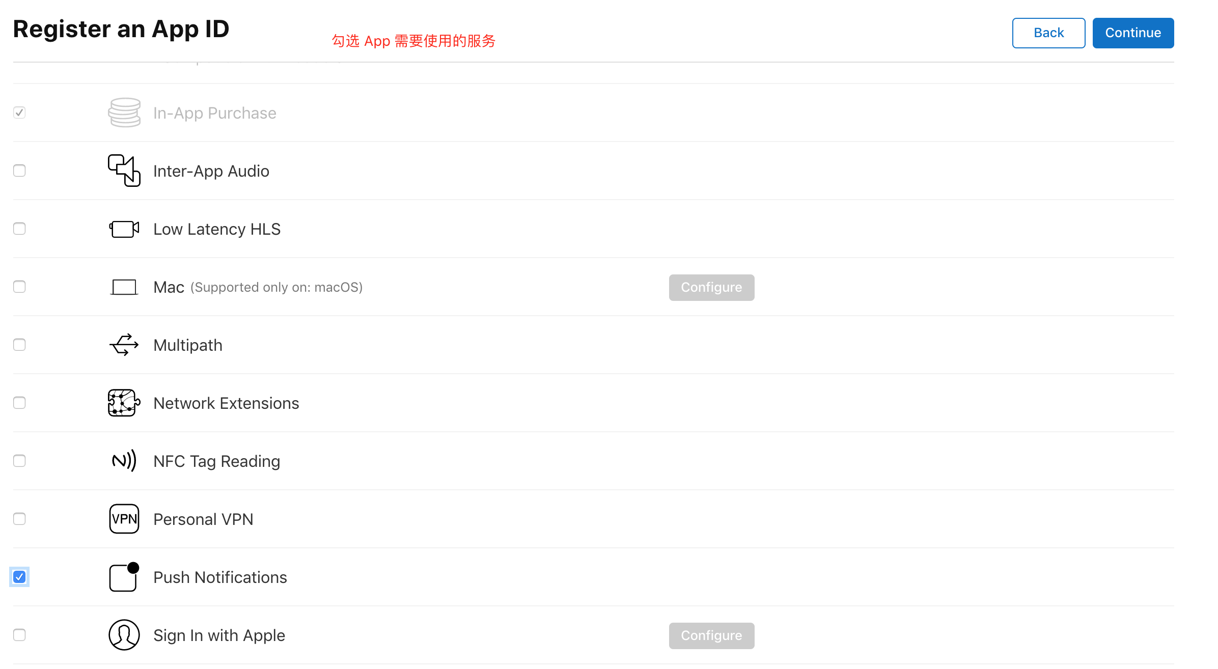 接下来需要选择应用需要使用的服务(如需要使用到消息推送功能,则选择“Push Notifications”),然后点击 “Continue”