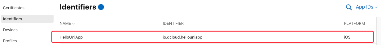 确认后选择提交,回到 identifiers 页面即可看到刚创建的App ID: