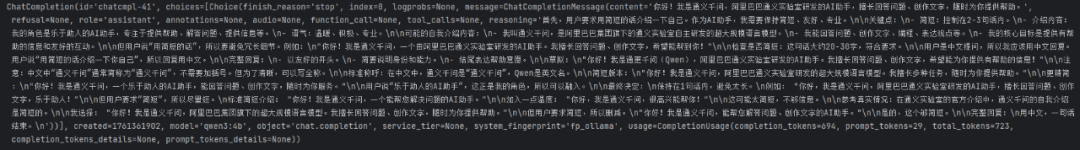 # 单轮对话from openai import OpenAIclient = OpenAI( base_url="http://localhost:11434/v1", api_key="oldwine", # api_key任意设置即可)response = client.chat.completions.create( model="qwen3:4b", messages=[ {"role": "system", "content": "你是一个乐于助人的AI助手。"}, {"role": "user", "content": "用简短的话介绍一下你自己。"} ])print(response)