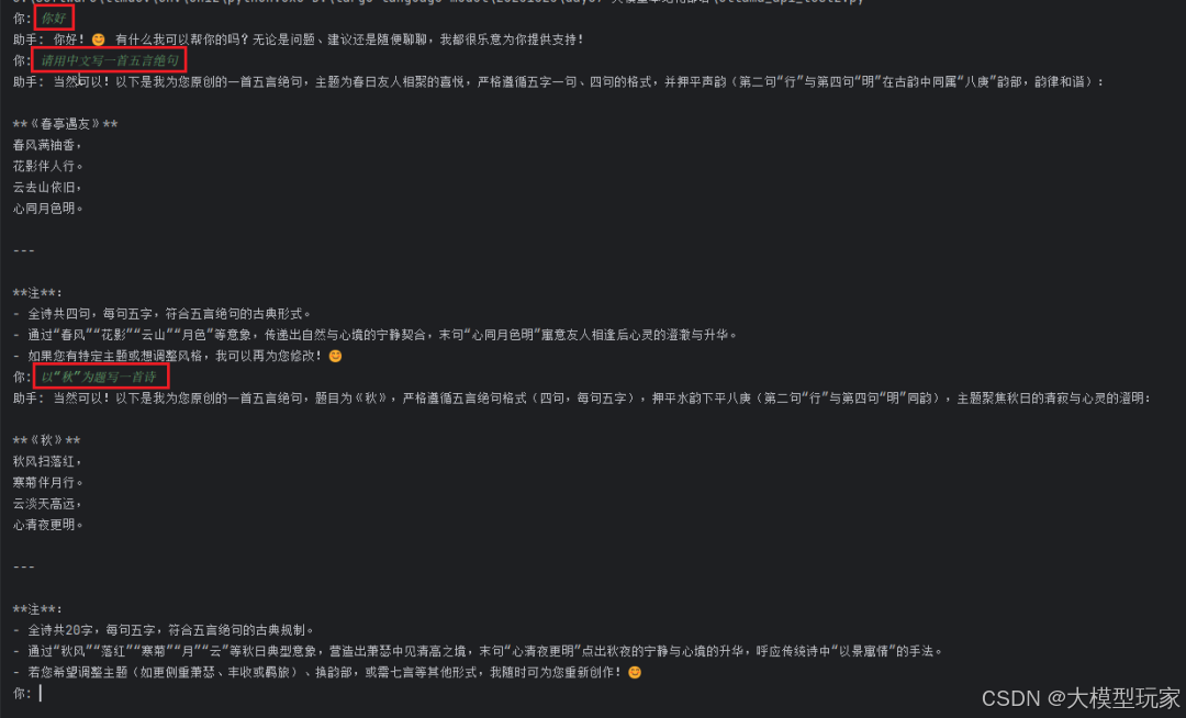 # 多轮对话from openai import OpenAI# 初始化客户端(根据使用的框架修改 base_url)client = OpenAI( base_url="http://localhost:23333/v1", # 默认端口 23333 api_key="empty"# 使用任意值)# 初始化对话历史messages = [ {"role": "system", "content": "你是一个乐于助人的AI助手。"}]# 多轮对话循环whileTrue: user_input = input("你: ") if user_input.lower() in ["退出", "exit", "quit"]: break # 添加用户输入到对话历史 messages.append({"role": "user", "content": user_input}) # 调用 API response = client.chat.completions.create( model="/root/autodl-tmp/model/Qwen/Qwen3-4B", # 根据部署模型修改 messages=messages ) # 获取模型回复 assistant_reply = response.choices[0].message.content print("助手:", assistant_reply) # 添加模型回复到对话历史 messages.append({"role": "assistant", "content": assistant_reply})